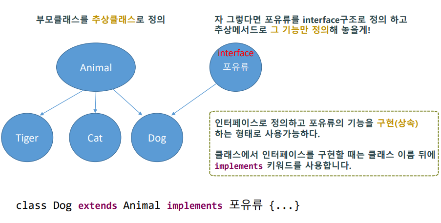 - class Dog extends Animal implements 포유류{...} <- 이렇게 사용하면 된다.